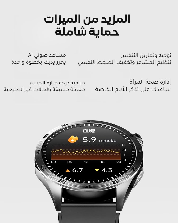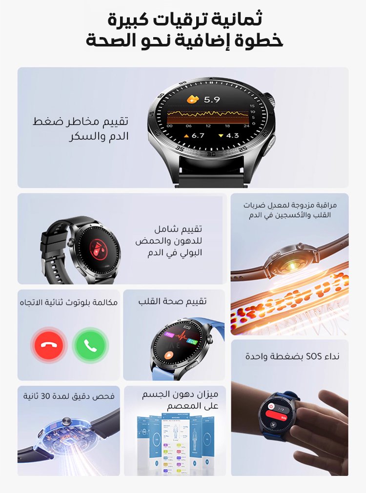 قبل 5 دقائق ساعة ذكية لتقييم مخاطر نسبة السكر وضغط الدم مع مكالمات بلوتوث - الستايل1
